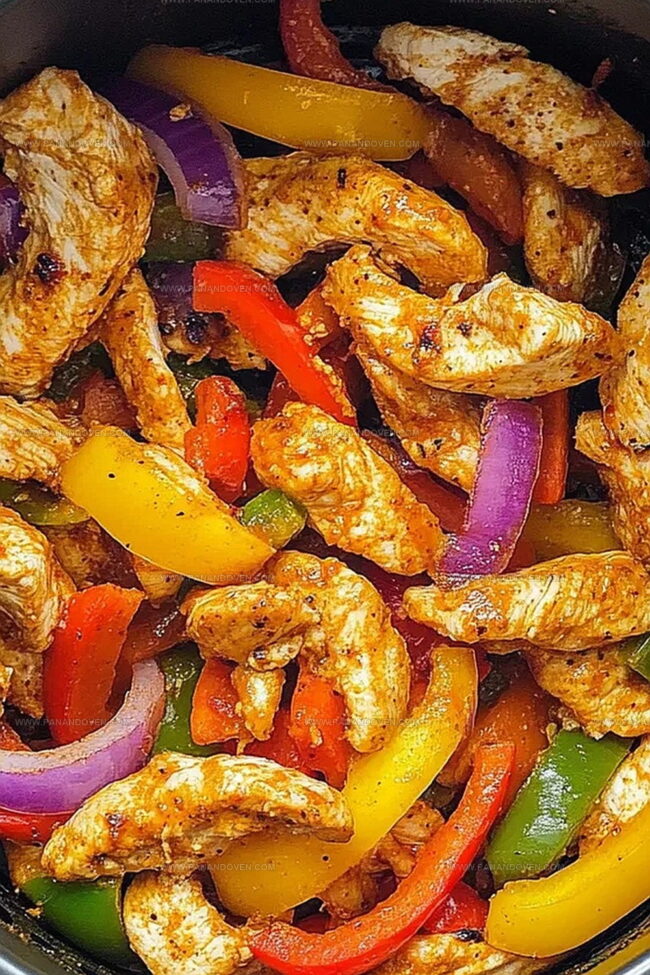 Tender strips of chicken sizzle alongside colorful bell peppers and onions, creating a meal that’s both quick and delicious.