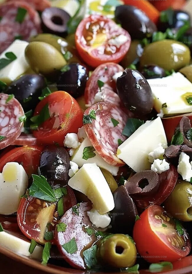 - Transfer the dressed antipasto salad to a serving platter, garnishing with additional fresh parsley for a bright, appealing presentation.