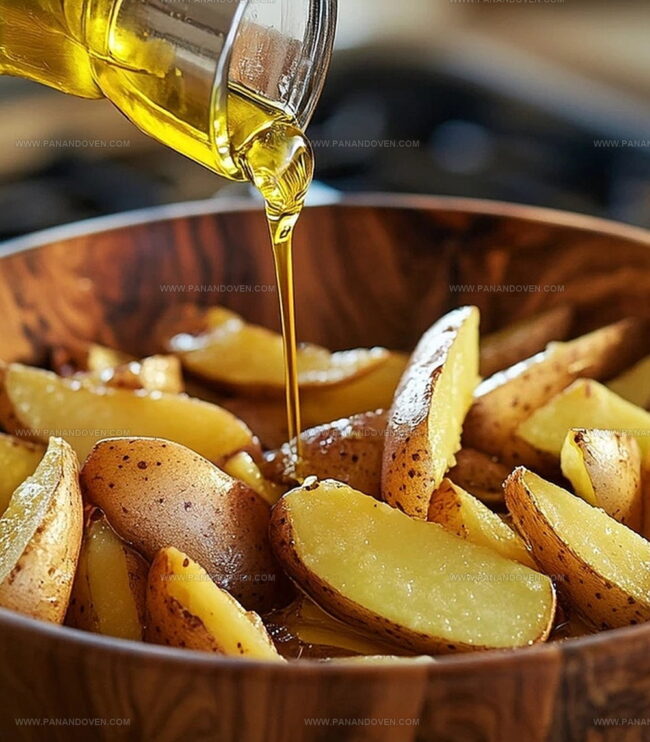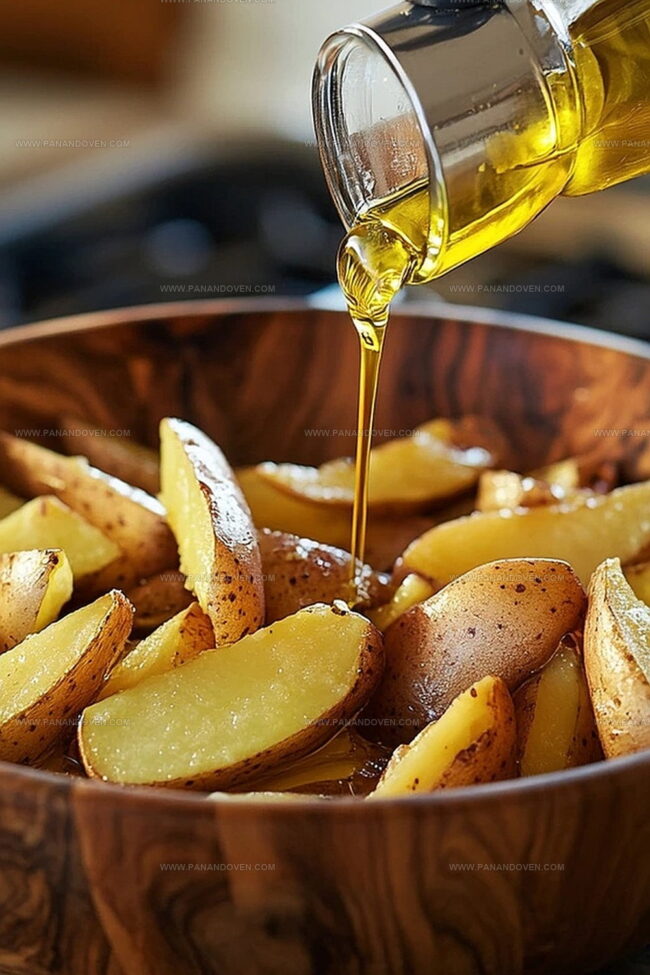 - Coat potato wedges thoroughly with olive oil, massaging each piece to guarantee complete and even coverage.