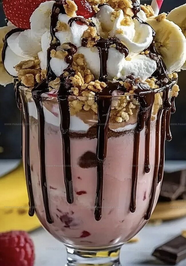 - Meticulously arrange an eclectic garnish featuring vibrant fresh strawberries, ruby-red raspberries, delicate banana slices, crunchy chopped nuts, golden granola clusters, crisp chocolate wafers, and a classic maraschino cherry perched atop the creamy masterpiece.