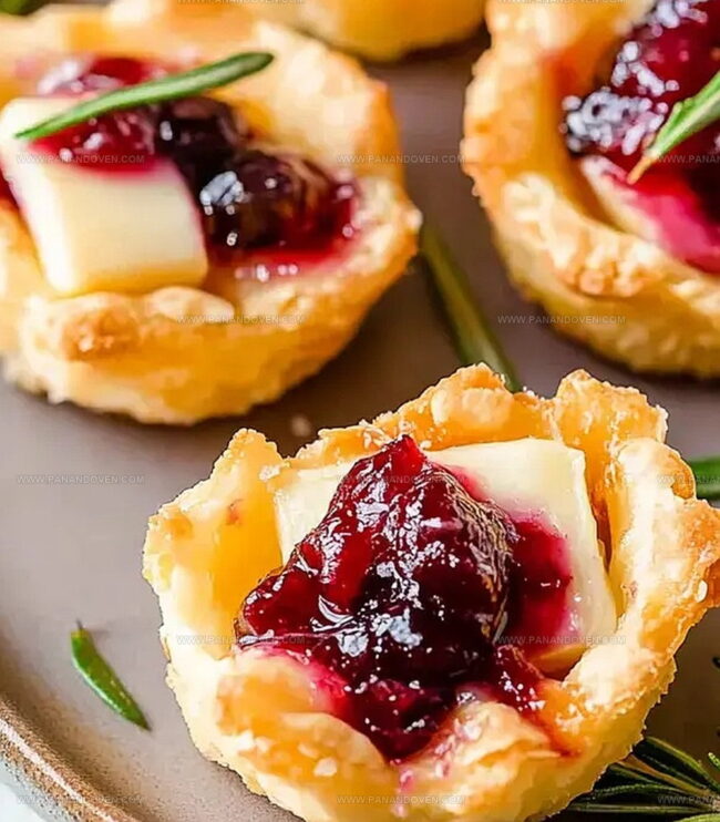 Festive Brie Bites with cranberry sauce offer elegant holiday appetizers perfect for seasonal gatherings. Crisp puff pastry and creamy cheese combine with tangy cranberry for sophisticated party bites that guests will adore.