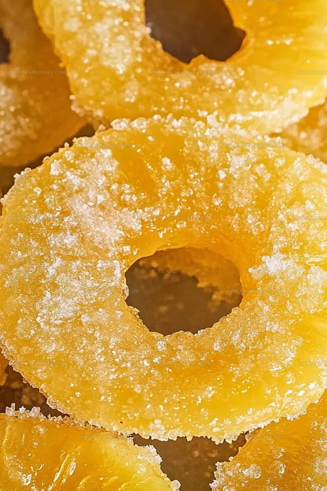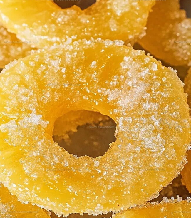 - Transfer the sugar-coated candied pineapple rings to a serving plate or storage container, separating layers with parchment paper to prevent sticking.