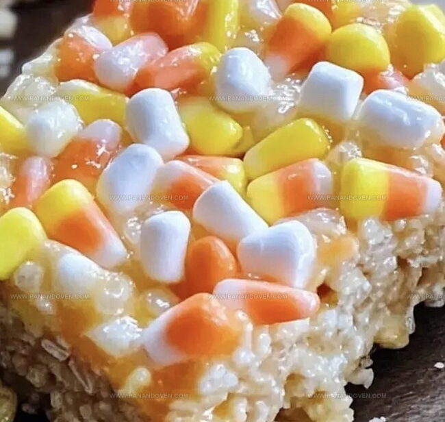 Crisp rice cereal provides the perfect crunchy base for vibrant orange and yellow candy corn pieces.