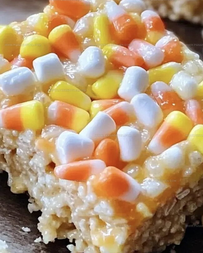 Marshmallow-studded squares sparkling with candy corn create an irresistible dessert that captures Halloween playful spirit.