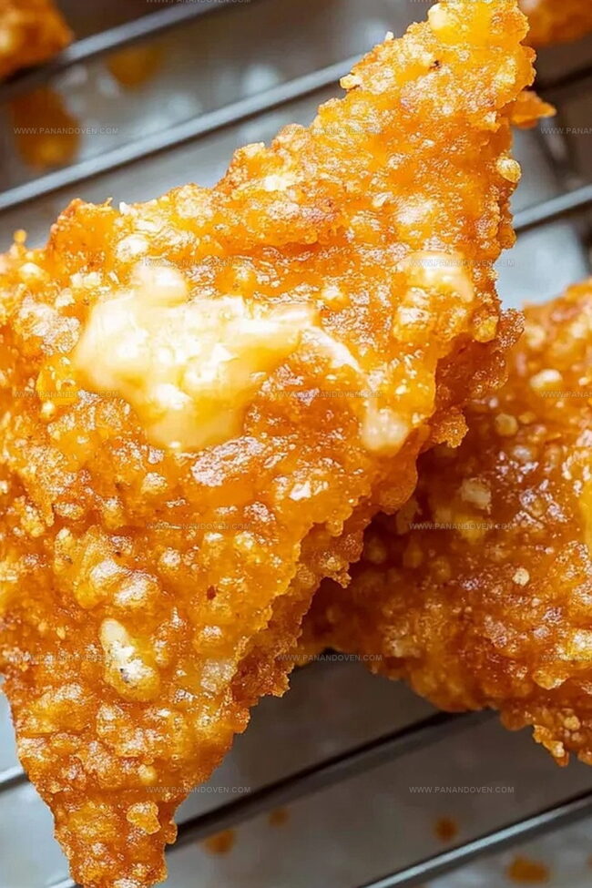 - Remove fried cheese triangles using a slotted spoon, placing them on a wire cooling rack to drain excess oil.