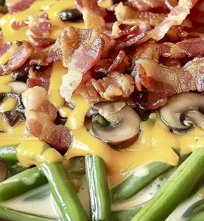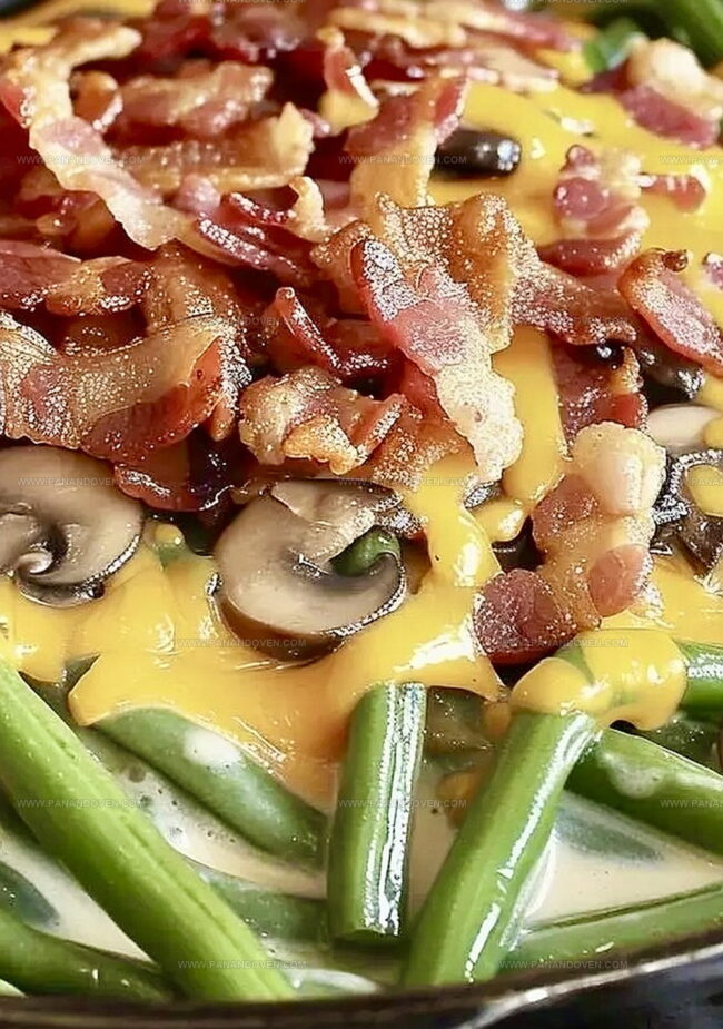 - Return skillet to medium heat, allowing casserole to simmer until green beans reach optimal temperature and sauce thickens, approximately 3-5 minutes. Garnish with remaining crispy bacon pieces.