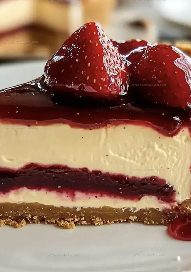 - Prior to serving, warm strawberry preserves and generously spread across the cheesecake’s surface.