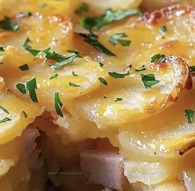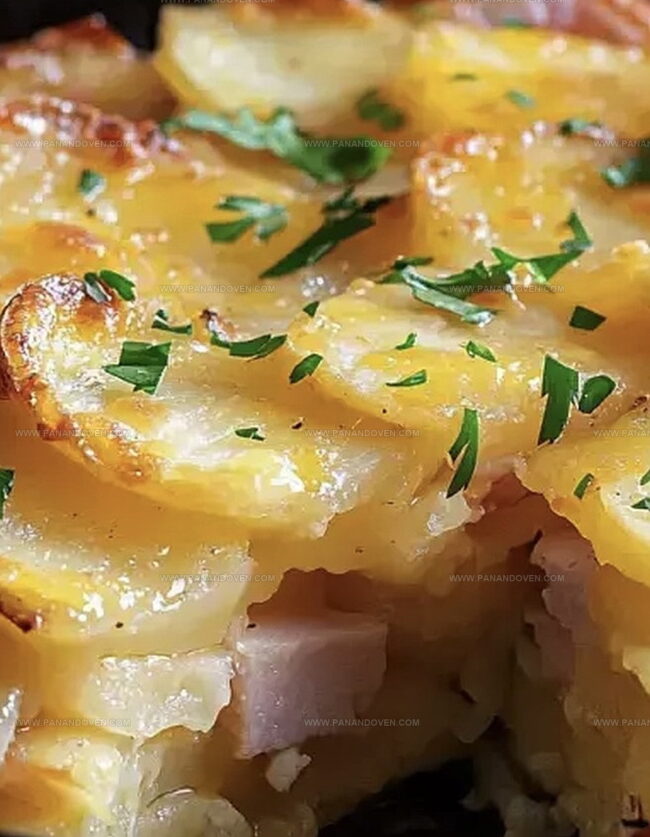 Hearty ham chunks nestle between melted gruyere cheese and tender potato slices.
