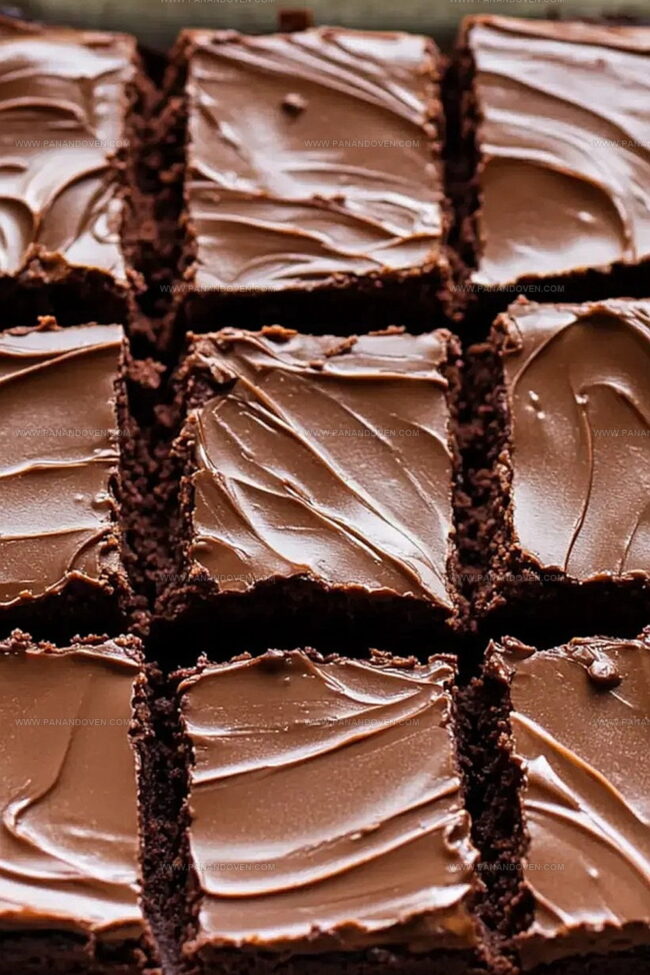 Smooth chocolate frosting crowns these brownies, adding an extra dimension of sweet, creamy decadence.