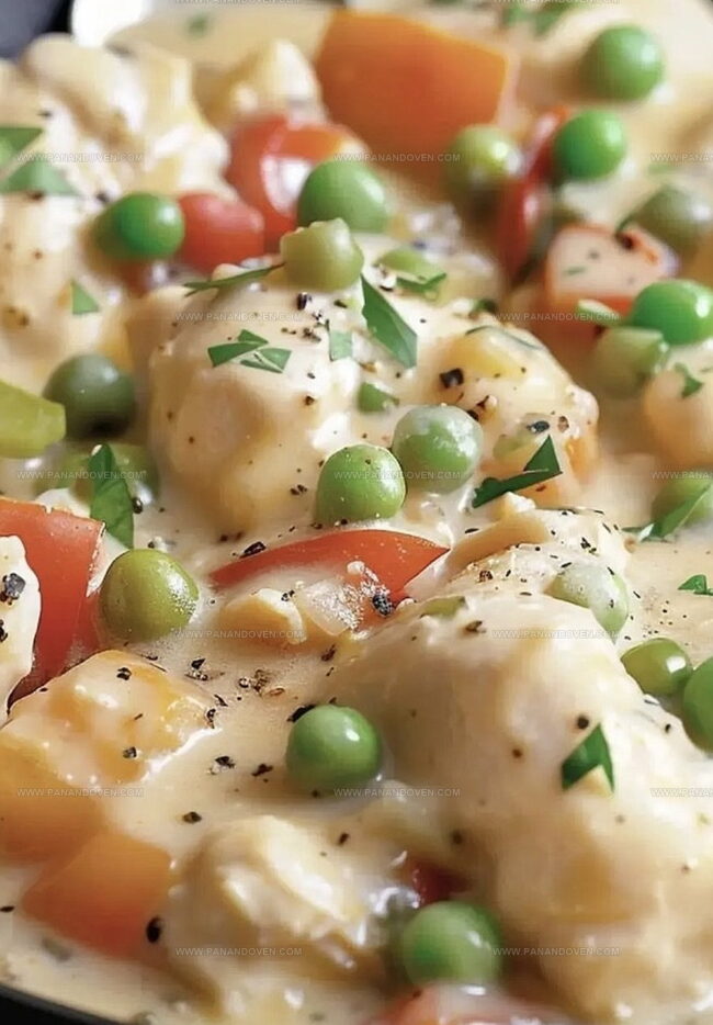 - Incorporate diced cooked chicken, frozen peas, and drained pimentos into the creamy sauce. Gently fold ingredients to ensure even distribution and harmonious flavor integration.