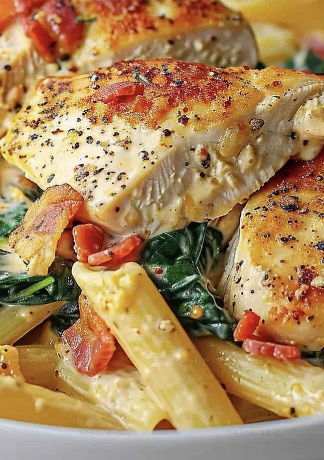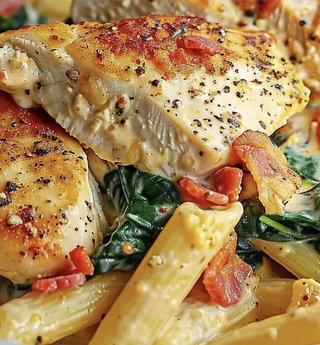 Savory chicken bacon pasta intertwines Italian culinary traditions with creamy comfort. Garlic-infused sauce, tender chicken, crisp bacon, and fresh spinach create a hearty meal packed with rich flavors you’ll crave again.