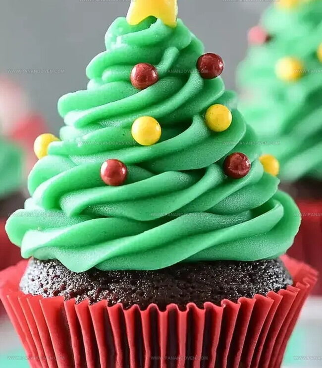 - Fit a piping bag with a triangular tip and carefully pipe frosting in an upward spiral motion, mimicking a Christmas tree shape on each cupcake.