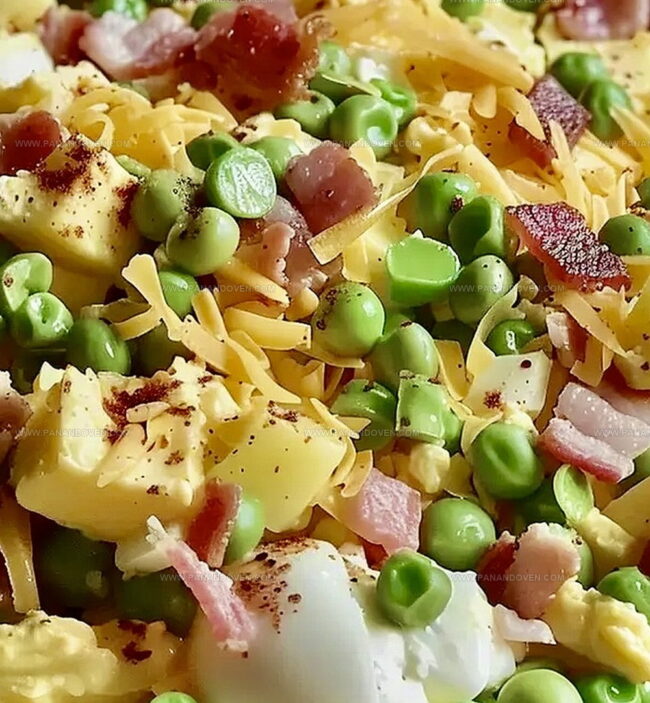 - Prepare a spacious mixing vessel and combine thawed green peas with finely chopped hard-boiled eggs, crumbled protein (bacon or ham), sliced green onions, and grated cheddar cheese.