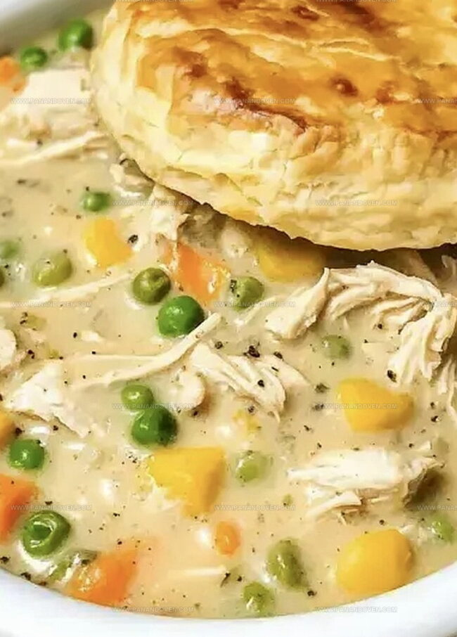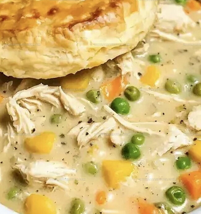 - Ladle the hearty chicken mixture into serving bowls and crown with freshly baked biscuits, creating a comforting and satisfying meal.