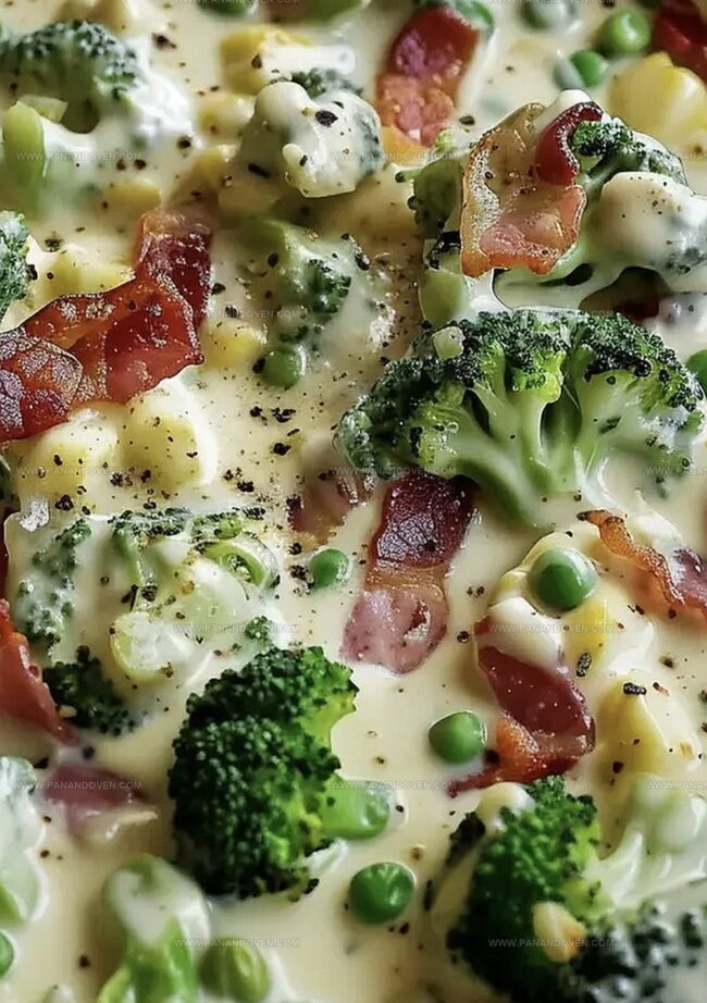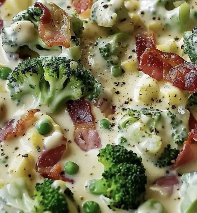 Fresh broccoli florets mingle with smoky bacon bits in a luxurious sauce that screams comfort food.