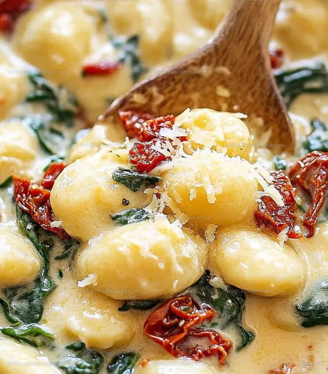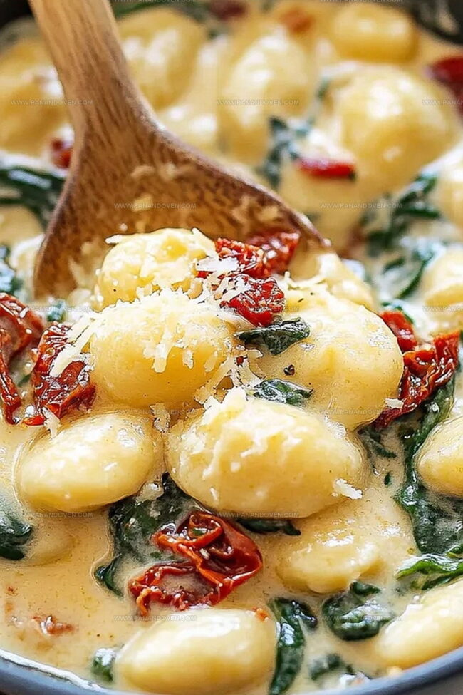 - Introduce sun-dried tomatoes and fresh spinach into the creamy sauce, allowing them to wilt and integrate their flavors. Gently fold the crispy gnocchi back into the skillet, ensuring each piece is generously coated with the sauce.