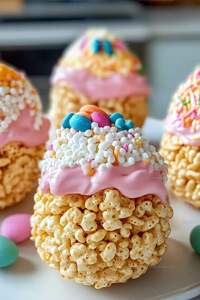 Pastel-hued sprinkles and delicate chocolate drizzles make these rice krispies eggs shine like edible gems.