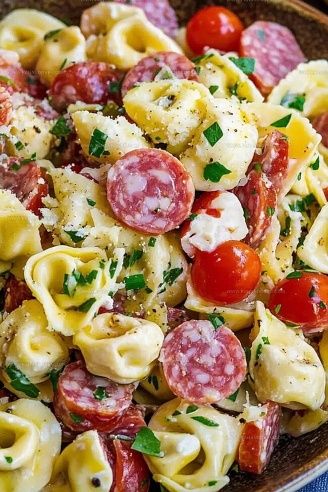 - Transfer warm tortellini to a spacious mixing bowl and introduce diced salami, fresh mozzarella with its aromatic oil, halved cherry tomatoes, and fragrant torn basil leaves.