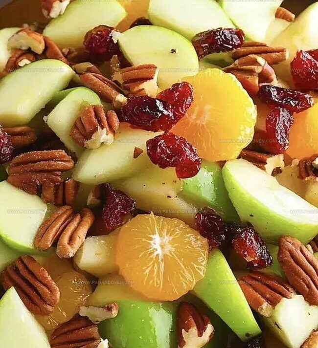 - Select a spacious mixing bowl and gently combine prepared apples, dried cranberries, cooled toasted pecans, whole grapes, and orange segments.