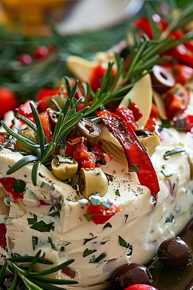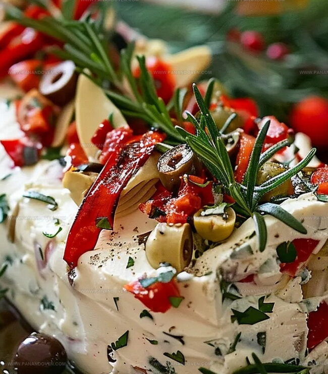 Festive holiday antipasto cream cheese log brings Mediterranean flavors to seasonal gatherings. Creamy spreadable cheese combines with zesty olives, herbs, and roasted peppers for a quick appetizer you’ll eagerly share with guests.