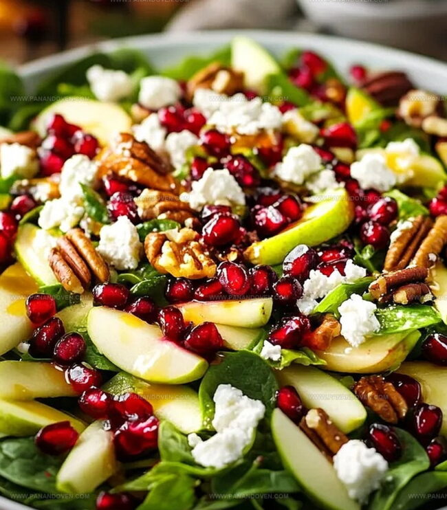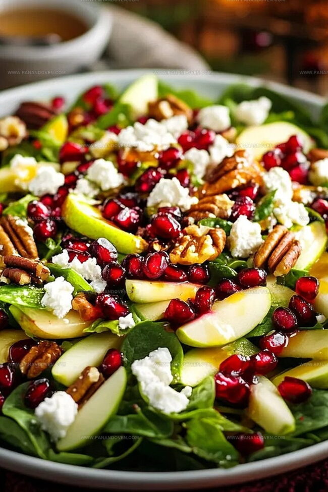 - Orchestrate the salad assembly by layering the prepared greens with pomegranate seeds, cranberries, apple slices, cooled nuts, and optional feta cheese in a spacious mixing bowl. Gently drizzle the honey mustard dressing, starting conservatively and adjusting to taste. Toss with a light touch to preserve the ingredients’ integrity and serve immediately for maximum freshness.