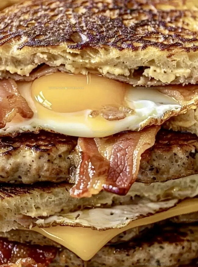 - Construct the sandwich by layering ingredients: start with a French toast slice, add sausage patty, crisp bacon, melted cheddar cheese, and a perfectly fried egg, then crown with another French toast slice.