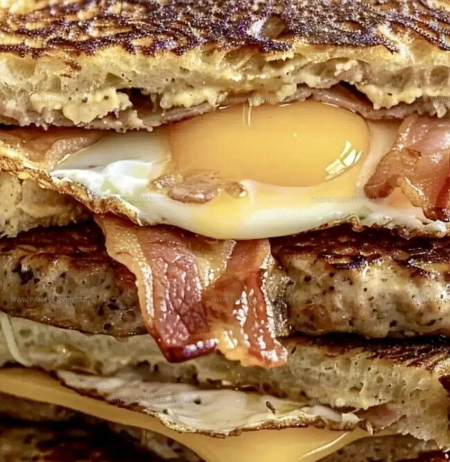 Crispy bacon, melted cheese, and fluffy eggs nestle between perfectly golden French toast slices.