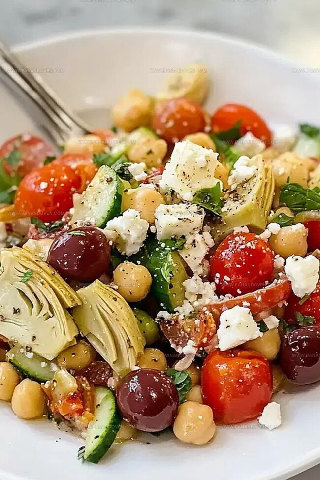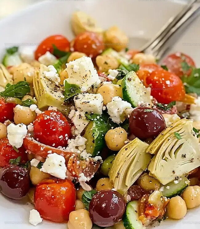 - Tumble chickpeas, marinated artichoke hearts, ripe cherry tomatoes, crisp cucumber slices, briny Kalamata olives, zesty scallions, and fragrant mint leaves into the seasoned dressing.