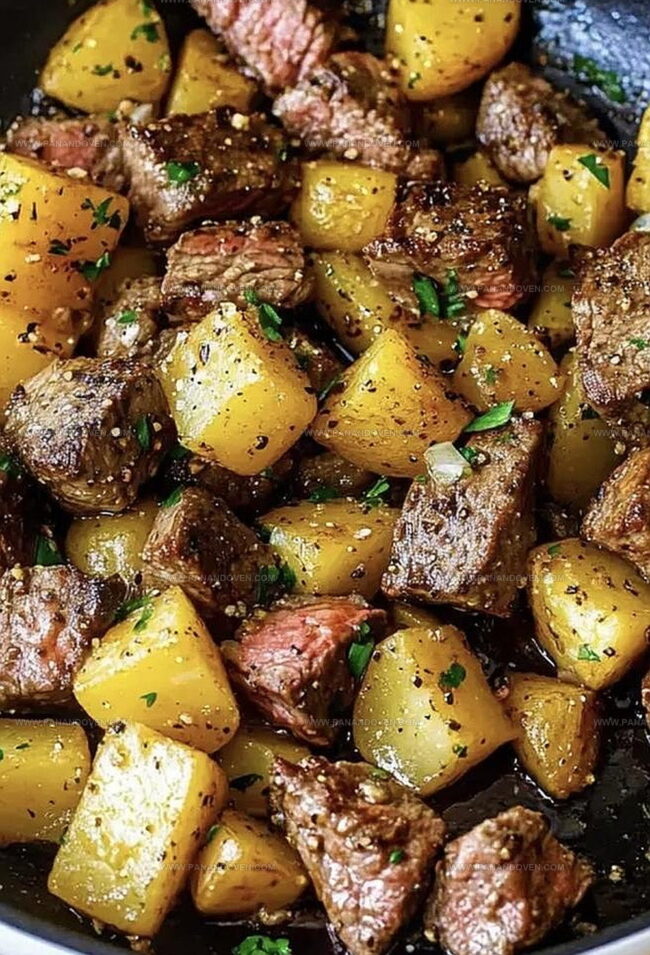 - Remove skillet from heat source and reunite cooked potatoes with seared steak bites, gently tossing to distribute flavors.