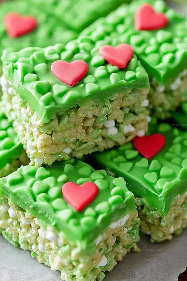 The green food coloring and heart sprinkles transform traditional rice krispie treats into a festive Grinch-themed dessert, perfect for Christmas parties or holiday celebrations.