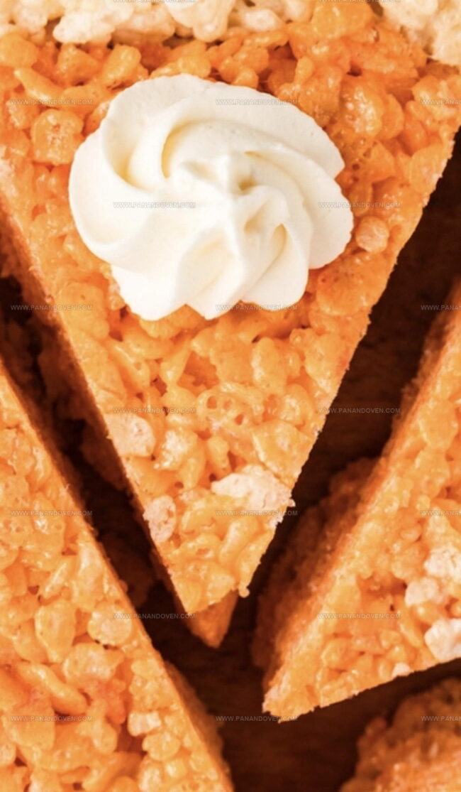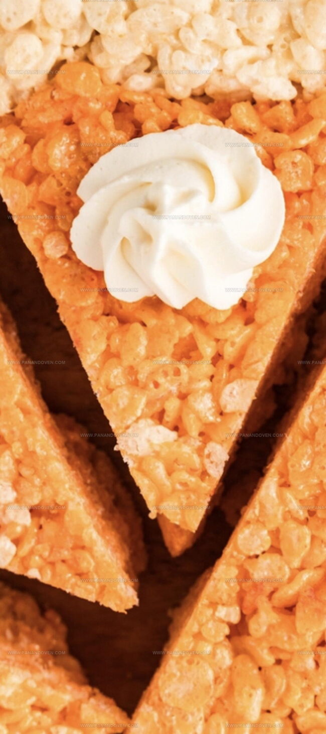 - In the third bowl, combine butter, marshmallows, and salt. Heat until fully melted, then blend in yellow food coloring. Integrate Rice Krispie cereal and encase the orange section with this vibrant layer, pressing evenly.