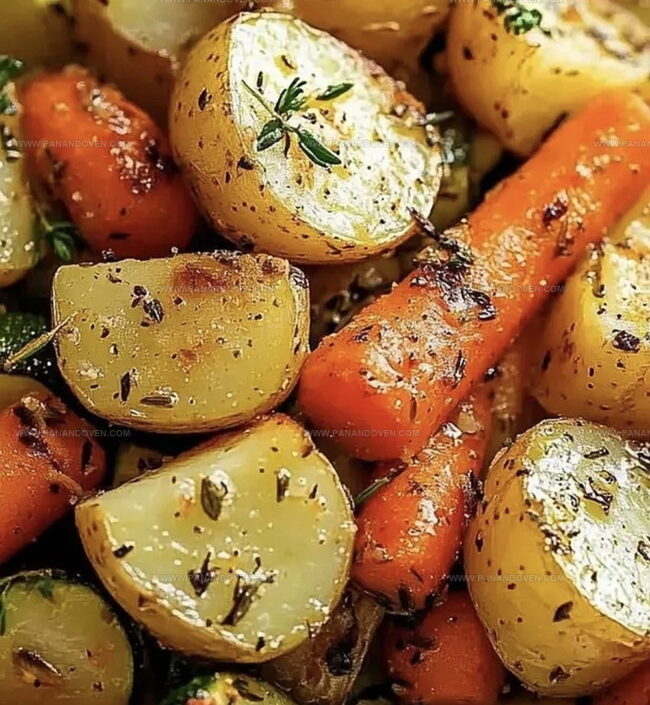 - In a spacious mixing bowl, thoroughly coat baby potatoes and carrots with olive oil, thyme, rosemary, salt, and pepper, ensuring complete coverage.