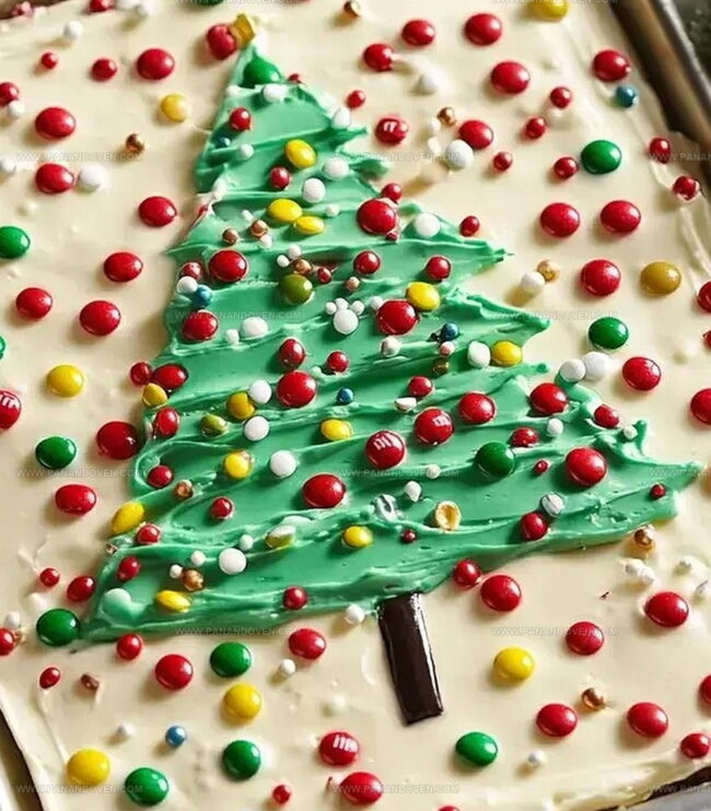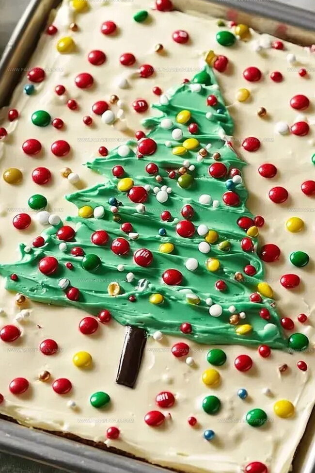 - Apply base frosting evenly across cake surface. Utilize green frosting to construct a detailed tree design, strategically placing candy decorations to enhance the holiday-themed aesthetic.