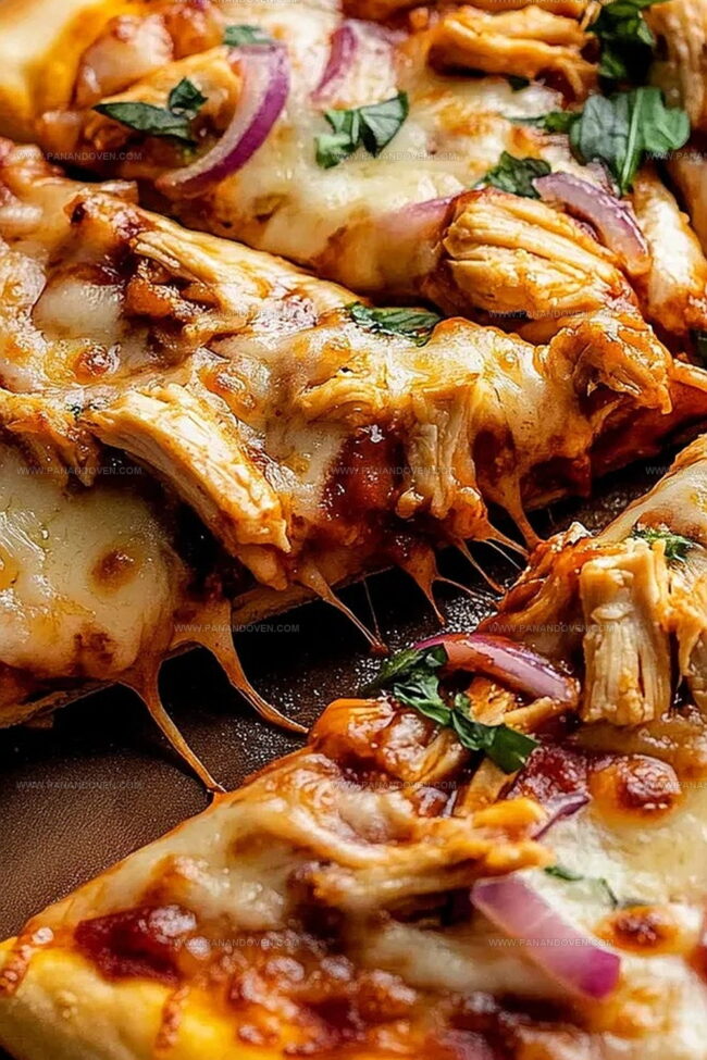 - Distribute pre-cooked chicken pieces that have been tossed in additional BBQ sauce across the pizza surface.