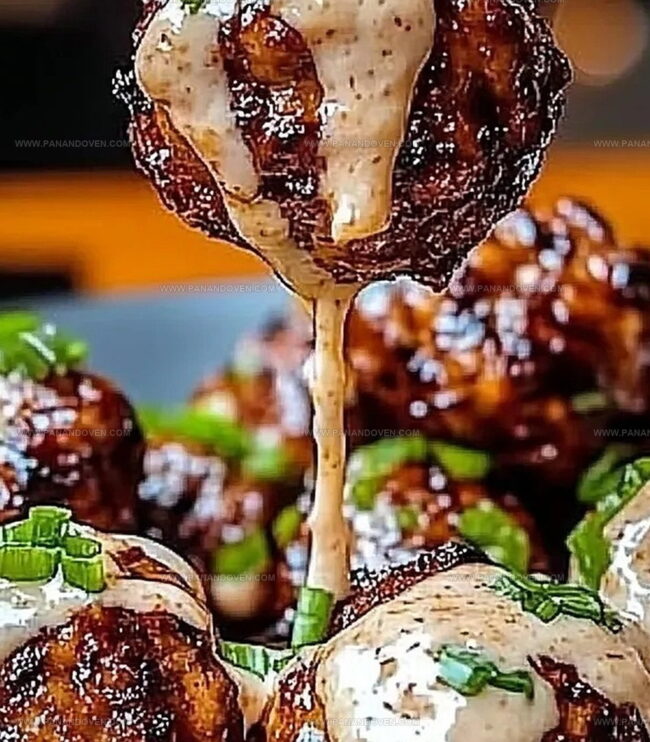 - Transfer perfectly cooked meatballs to a serving platter, accompanied by the spicy mayo dip, garnishing with additional sliced green onions for a fresh, colorful presentation.