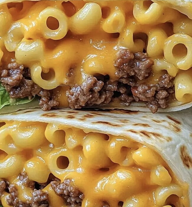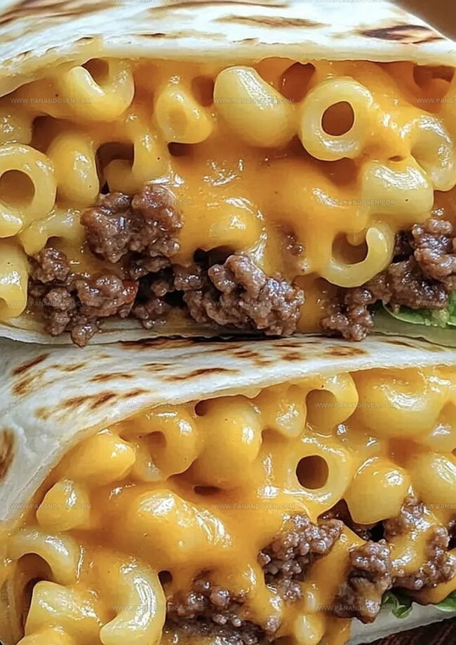 Creamy, cheesy macaroni blends seamlessly with juicy ground beef inside a warm tortilla.