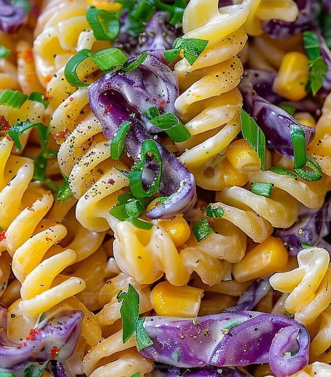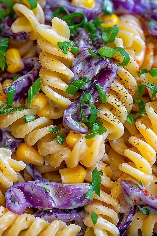 - Introduce shredded purple cabbage and thinly sliced green onions into the pasta-corn mixture, ensuring uniform distribution of ingredients.