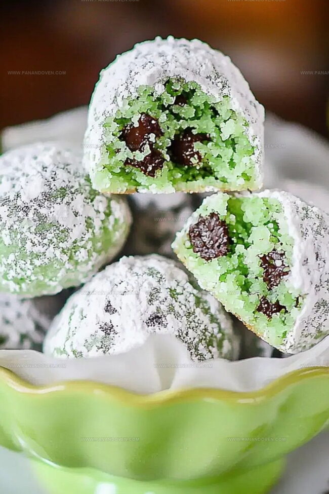 Soft, buttery cookies dance with delightful mint chocolate chip snowball magic, creating a winter wonderland of flavor.