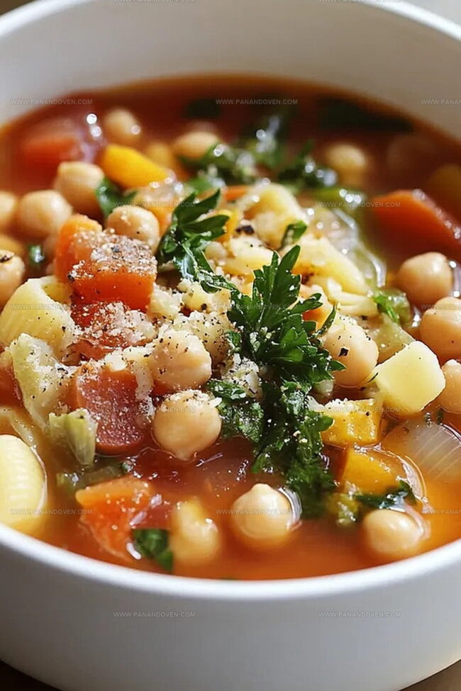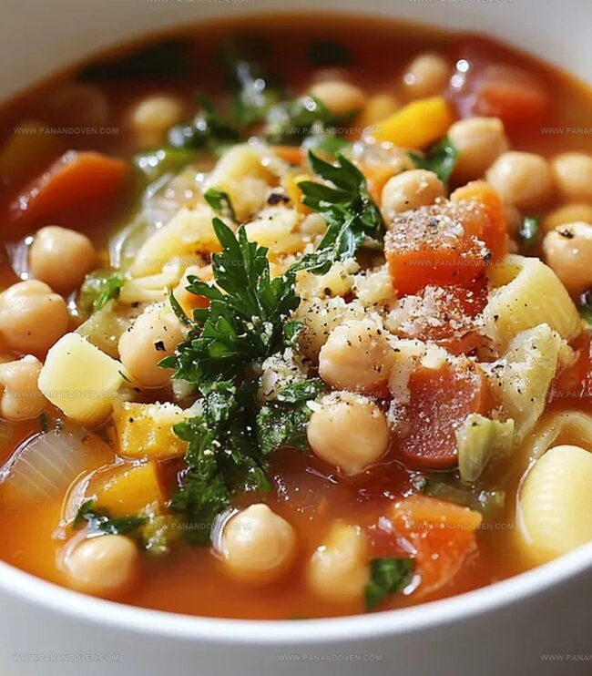 The soup is packed with nutrients from vegetables like carrots, celery, potatoes, and protein-rich chickpeas. It’s a balanced, healthy meal option.