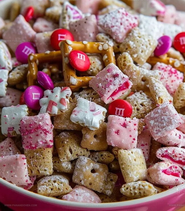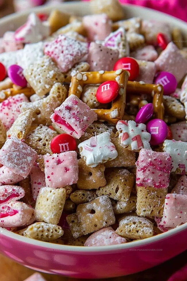 Chocolate-covered treats take on a romantic twist with this irresistible pink Valentine’s puppy chow mix that sparkles with festive charm.