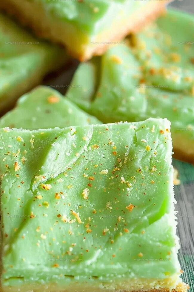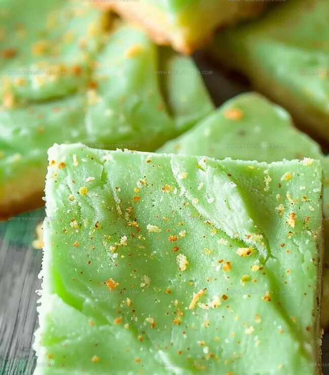 - After cooling, slice the bars into desired serving sizes, revealing the subtle green hue and rich pistachio flavor within each delectable square.