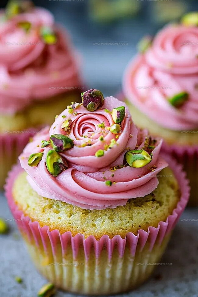 - Fill a piping bag with pink buttercream. Pipe from the center of each cupcake in a circular motion, working outward and upward. Garnish with chopped pistachios and an optional dried rosebud for an elegant finish.