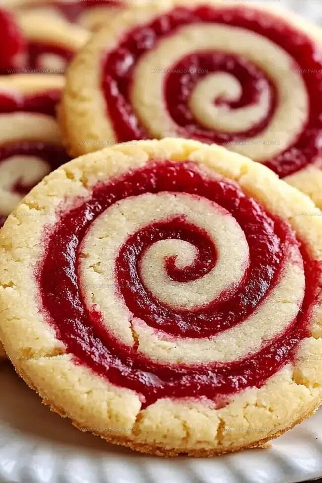 Delicate swirls of deep red raspberry contrast beautifully against the pale, tender cookie base.