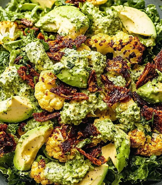Tender golden-brown cauliflower florets dance with creamy herb-packed dressing, creating a symphony of textures and tastes.
