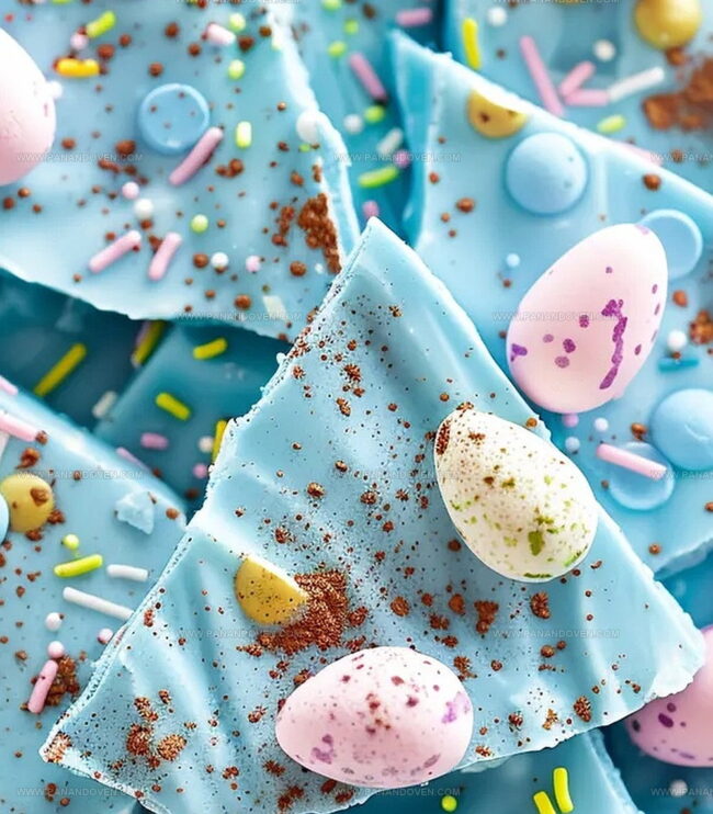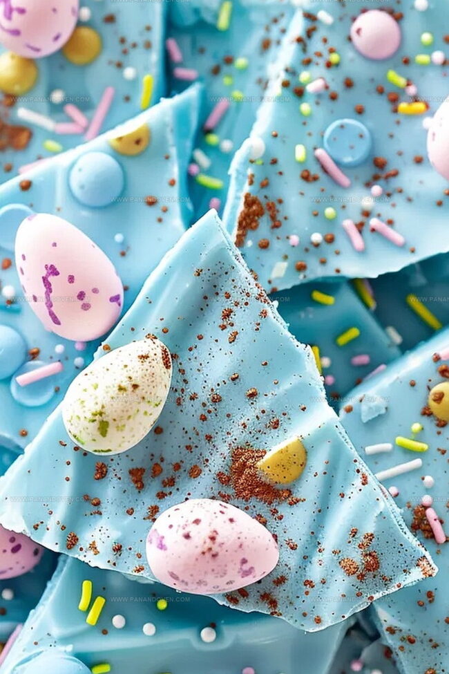Pastel-hued candy treats with Robin egg Easter bark sparkle like springtime confetti, catching every eye at the dessert table.
