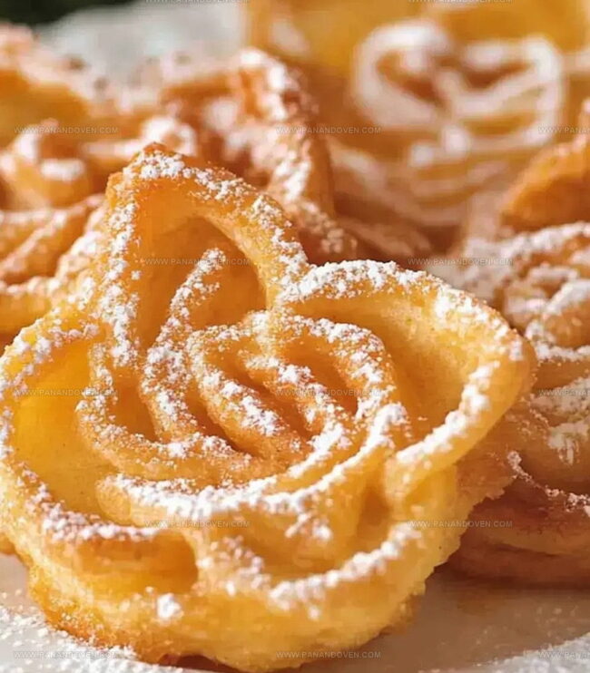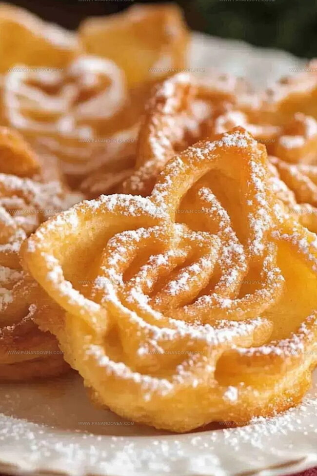 - Once cooled slightly, dust the rosettes generously with powdered sugar, creating a delicate, sweet finish before serving.