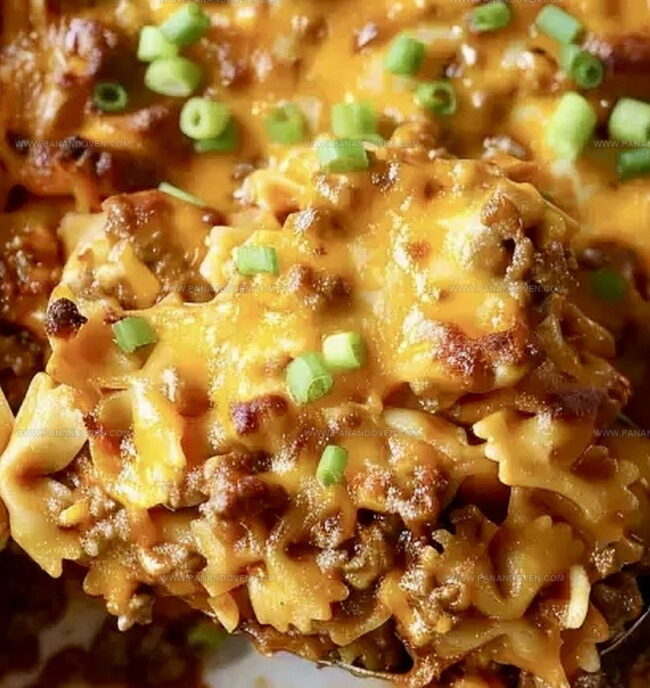 - Transfer the cheesy beef and pasta mixture into the prepared baking dish, spreading evenly across the surface.