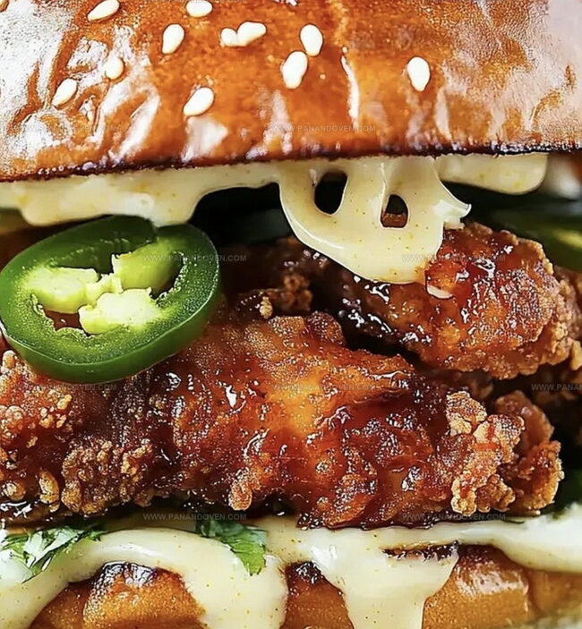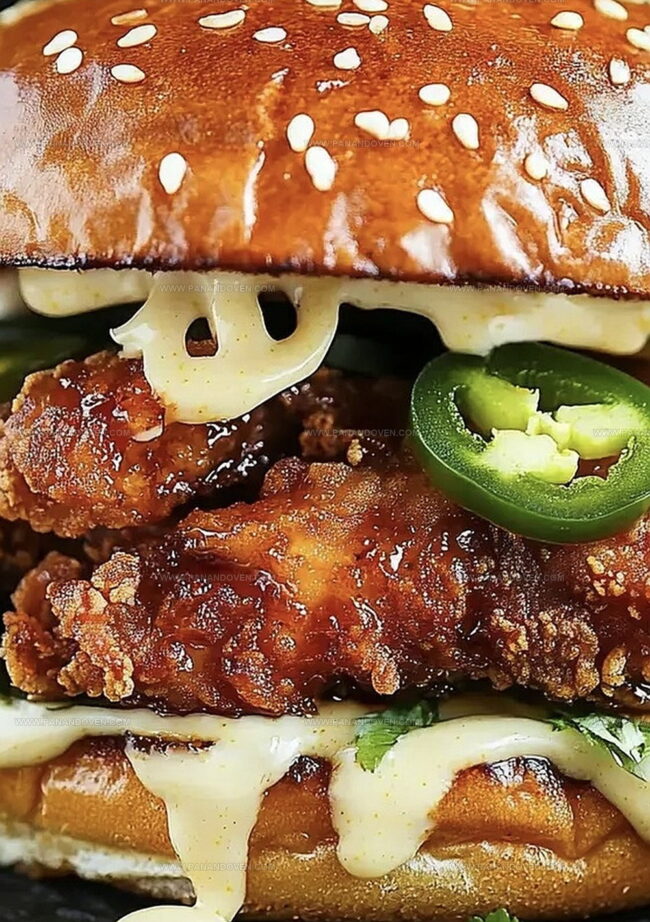 - Lightly butter and toast burger buns until edges are golden. Layer each sandwich with melted cheese, crisp lettuce, tangy pickle slices, freshly fried chicken, drizzle of hot honey sauce, and a generous spread of spicy mayo.