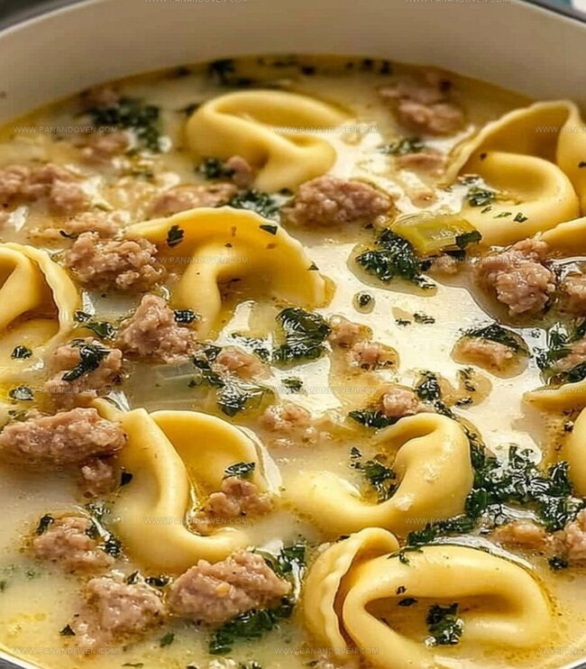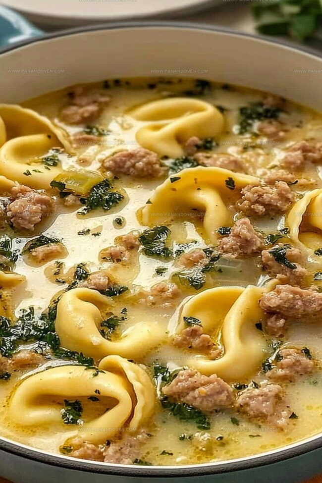 Chunky sausage pieces nestle between delicate tortellini, creating perfect texture contrasts.