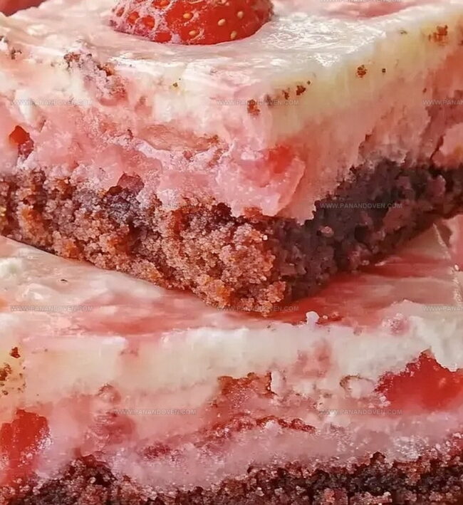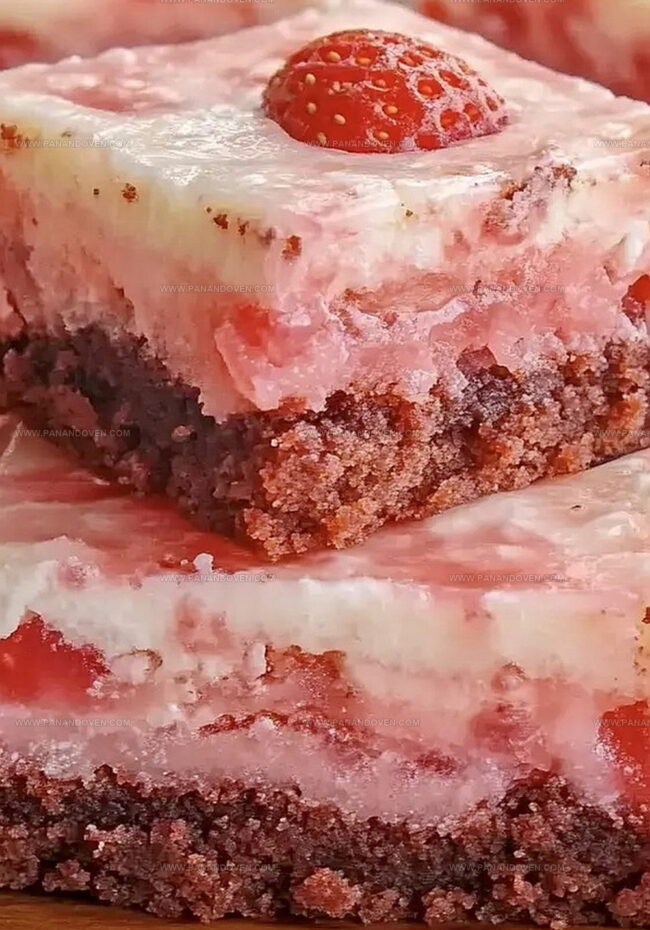 - Create the brownie base by whisking melted butter with eggs, then incorporating strawberry cake mix and strawberry gelatin until a smooth, thick batter forms.